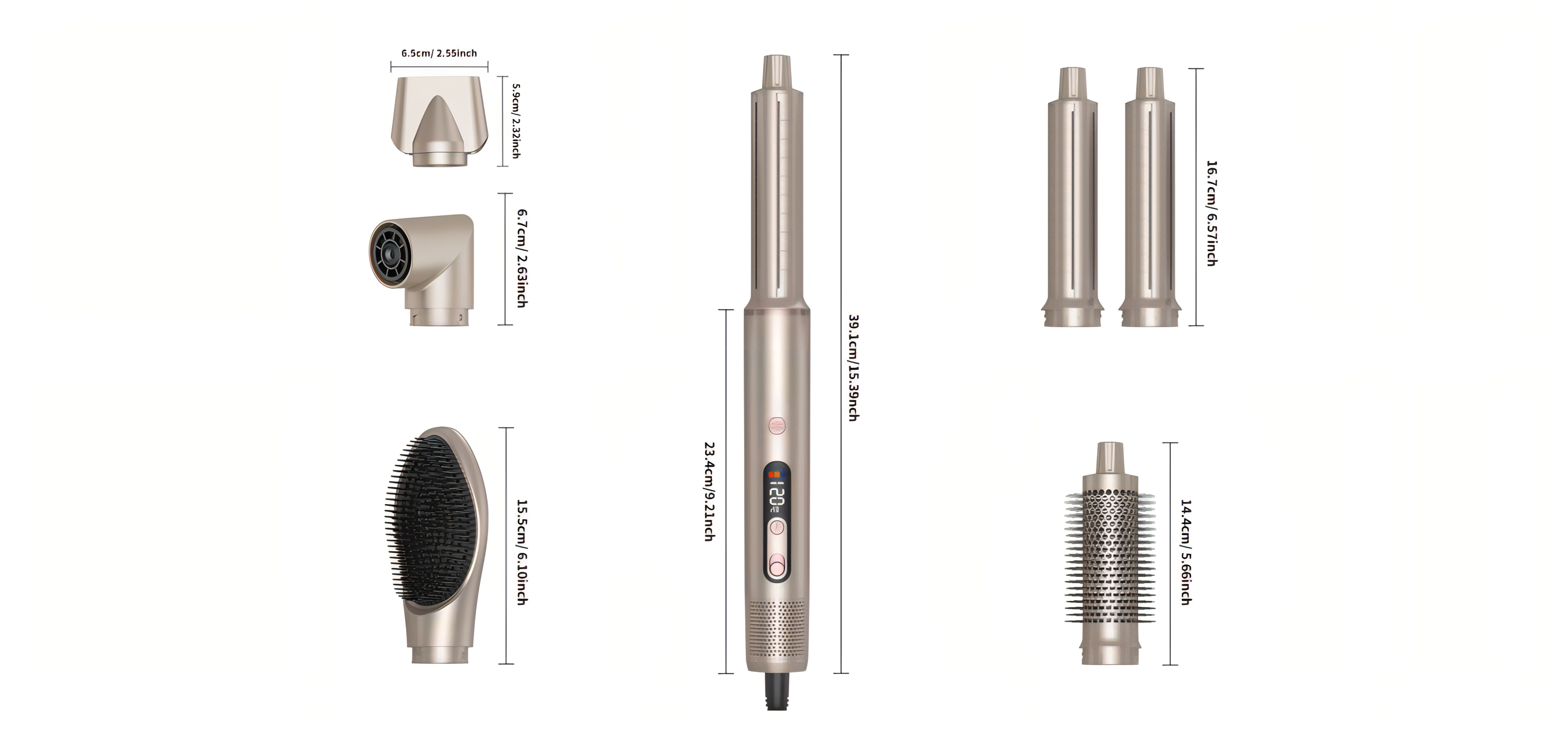 Incluye cepillo de aire caliente, barriles rizadores izquierdo y derecho, boquillas de secado y concentrador, y cabezal alisador. El cepillo seca rápido creando rizos naturales; los barriles forman ondas suaves; las boquillas dirigen el aire para un secado más veloz; el cabezal deja el cabello liso. Un estilo completo y profesional en un solo equipo.